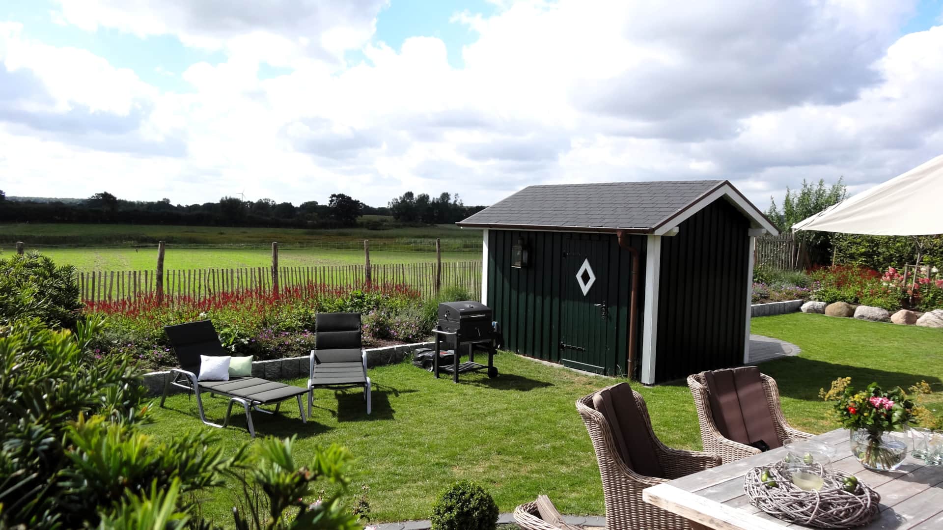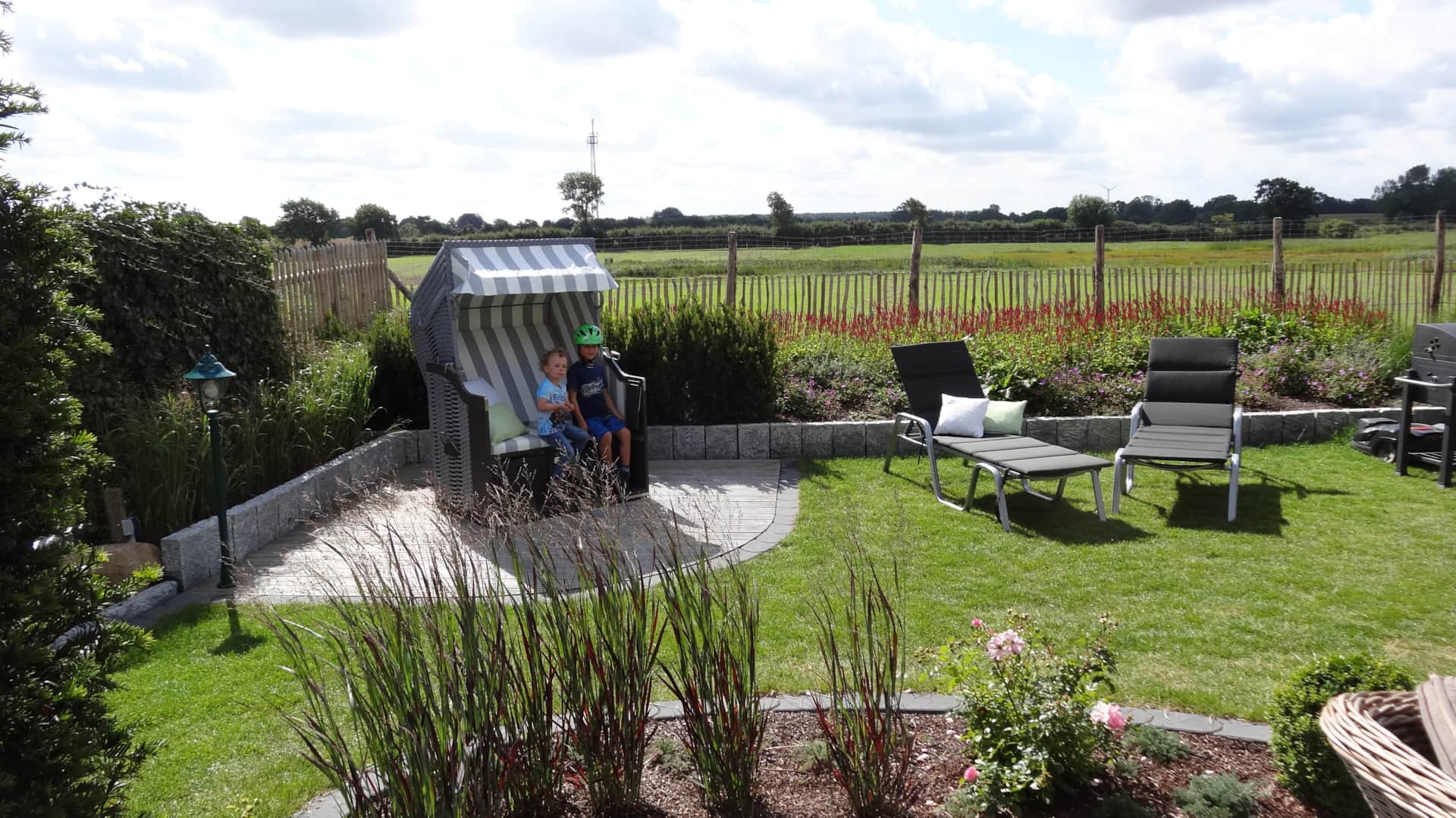Je nach Sonnenstand können Sie Ihren Lieblingsplatz im Außenbereich wählen, denn es stehen Ihnen zusätzlich eine zweite Terrasse, ein Strandkorb und Sonnenliegen zur exklusiven Nutzung zur Verfügung! Für laue Sommerabende steht ein Grill bereit, sodass auch einem Barbeque in familiärer Runde nichts entgegensteht.